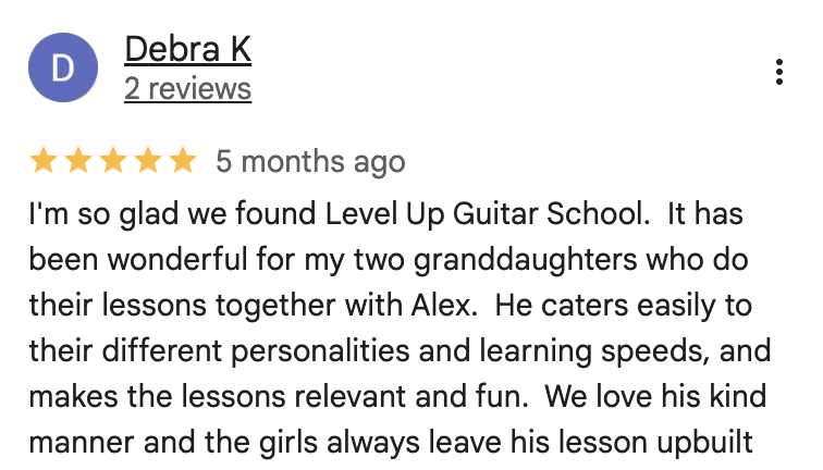 “My son (13) loves going to guitar lessons and always want to improve and get better and I have Alex to thank for this. He makes the lessons challenging, fun and engaging. Highly recommend!” - Leanne T.